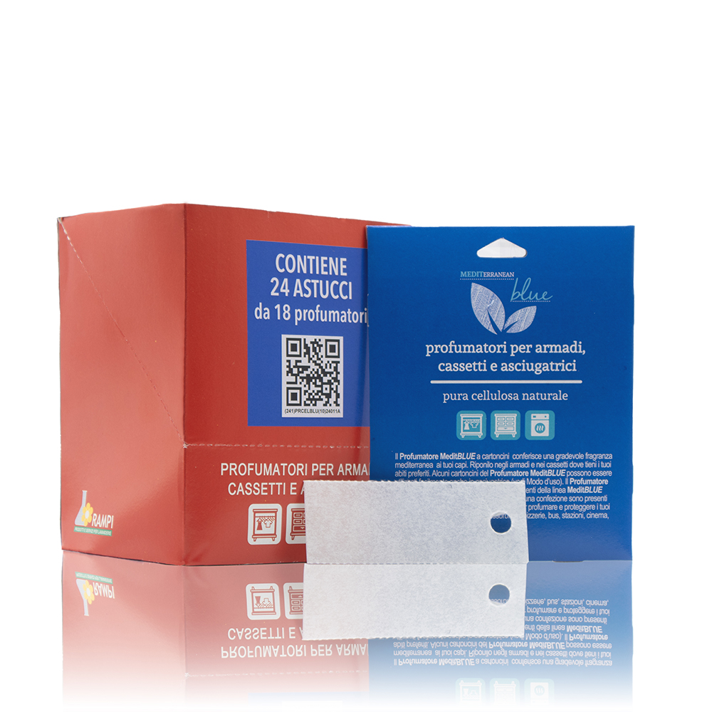 Il Profumatore MEDIT BLUE a cartoncini in cellulosa conferisce una gradevole fragranza ai capi e contrasta i cattivi odori di ambienti come pizzerie,cinema, palestre ecc..