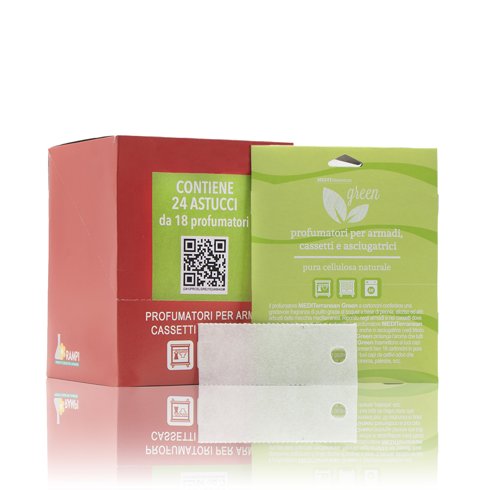 Il Profumatore MEDIT GREEN a cartoncini in cellulosa conferisce una gradevole fragranza ai capi e contrasta i cattivi odori di ambienti come pizzerie,cinema, palestre ecc..