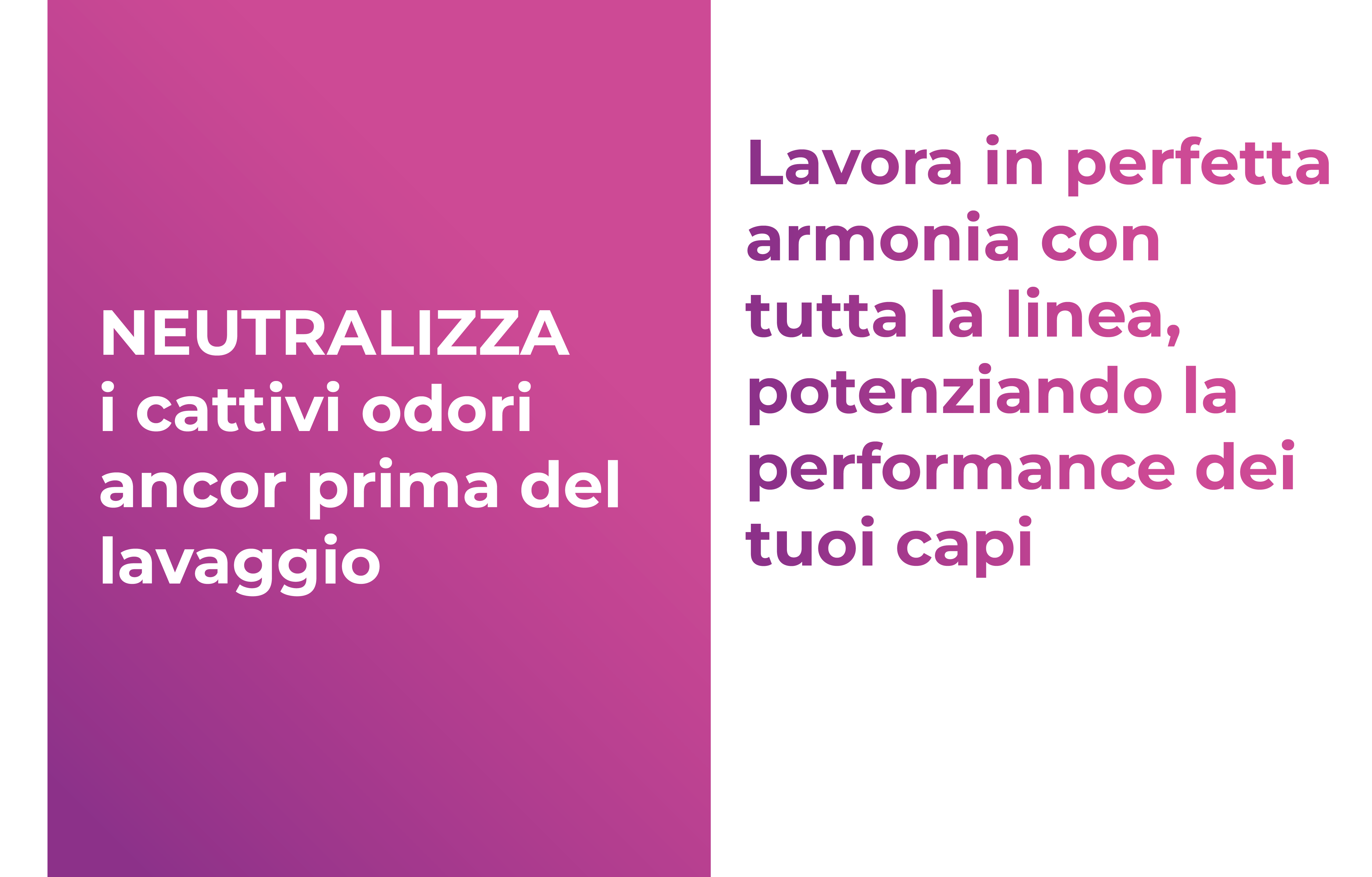 Nebulizzato sui capi inizia ad agire sullo sporco ancor prima del lavaggio neutralizzando la proliferazione di cattivi odori nel cesto portabiancheria.