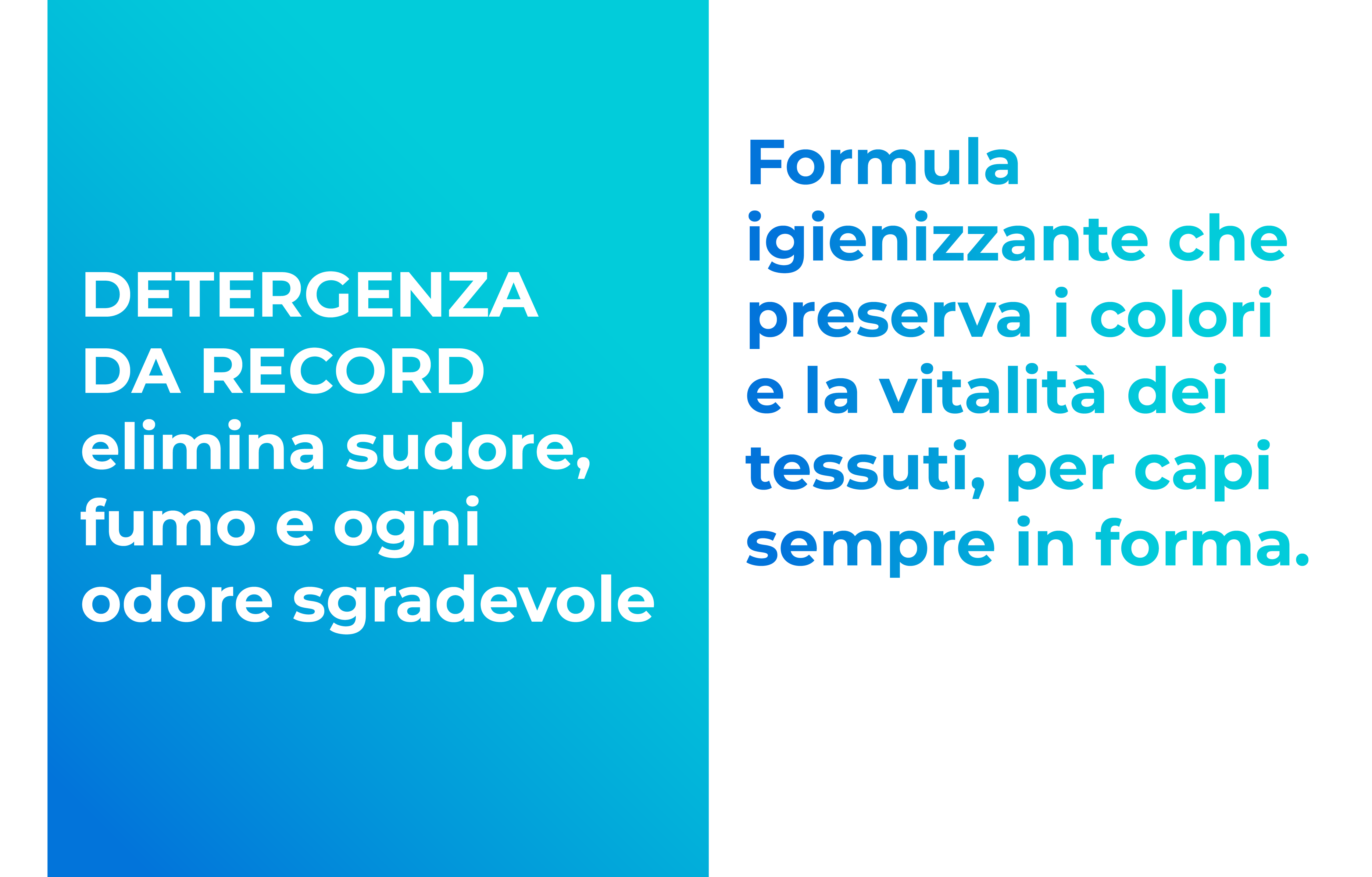 Attivo già a 20°C grazie alla formula concentrata con tensioattivi di origine vegetale. La presenza di principi attivi igienizzanti – combinati con la molecola “cattura odori” – permette un’azione mirata sugli odori sgradevoli come sudore, urina, fumo, muffa, animali domestici, fritto e li neutralizza completamente.